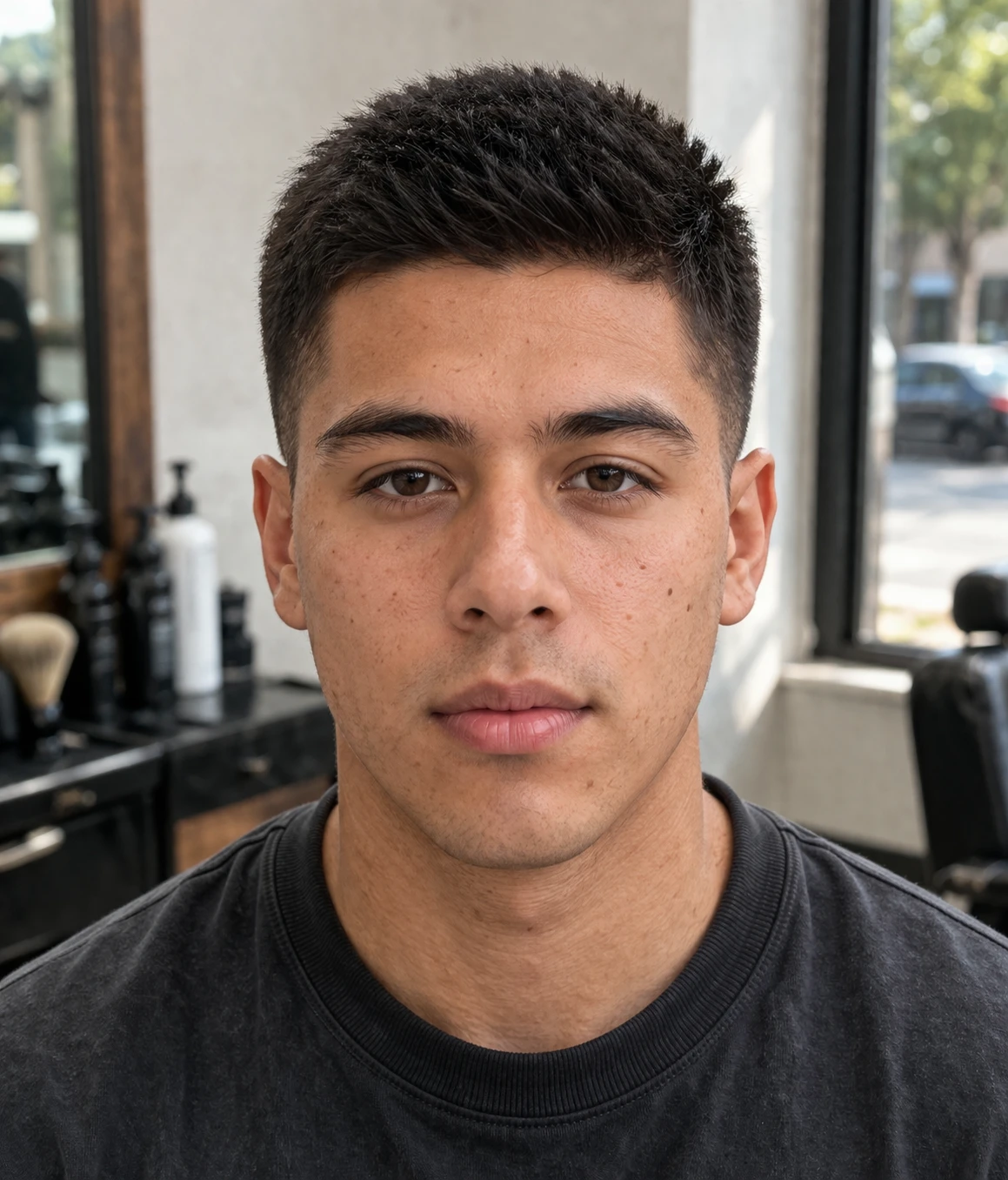 The brush cut is a short style with slightly upright top texture and tidy sides. It is easy to maintain and suits people who want quick daily styling.
