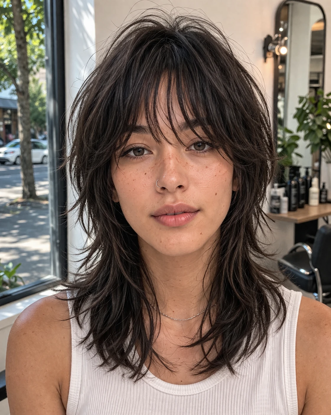 The shag cut uses layered structure to create natural volume and texture throughout the crown and mid-lengths. It is versatile and can be styled messy or more controlled.